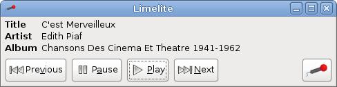 Limelite's main window is divided in two. The top shows data about the currently playing song, and the bottom has common media controls (play, pause, next and so on) and a toggle button that enables or disables karaoke mode.