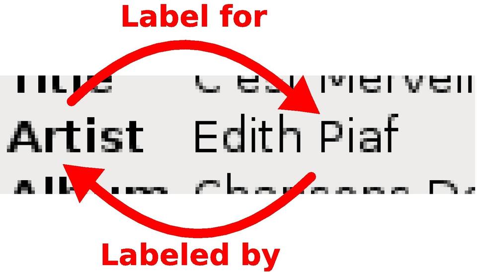 With Limelite as an example, the label containing the Artist string needs to have a “label-for” relationship with the label holding Edith Piaf, and the Edith Piaf label in turn needs to have a “labeled-by” relationship with the label holding Artist. Similar reciprocal relationships need to be defined for the Title and Album fields.