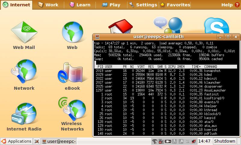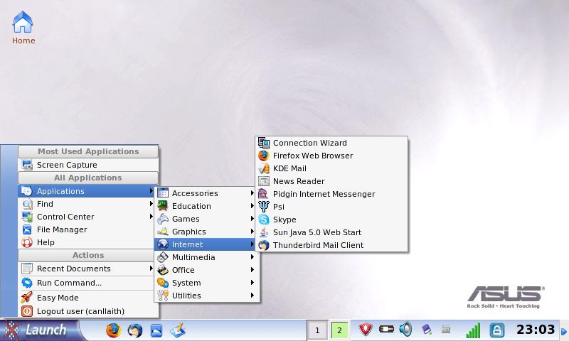 During the course of adding applications to the menu, the observant will notice that the Eee ships with most of KDE installed. During its development phase, the Eee exposed an option to enable a full desktop mode with a complete KDE 3.4 desktop. The most elegant solution for enabling the full desktop is to install a package that does the configuration for you from wiki.eeeuser.com/howto:getkde. This package essentially downloads the packages for kicker and ksmserver, and modifies the ASUS startup scripts. It adds an option to log in to full desktop mode from the easy mode shutdown dialog. To get back into easy mode, there is an option in the K menu. This page also details the manual methods for enabling full desktop mode.