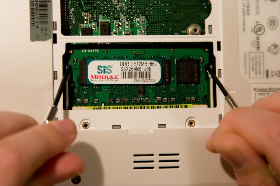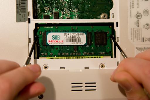 To remove the memory that shipped with your Eee, carefully use a pair of small screwdrivers or your fingers to lever the clips outward. The memory module will pop upward when it is free of the clips. Remove the module from the slot, taking care to touch only the very outside edges of the module.