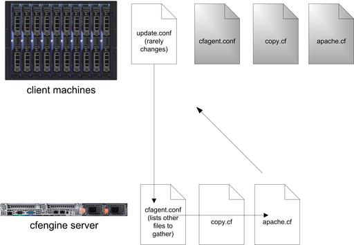 The master configuration file for each host is cfagent.conf. This file can contain all the configuration information and cfengine code for the host, a subset of hosts or all hosts in the cfengine network. This file is often just a starting point where all configurations are stored in other files and “imported” into cfagent.conf, in a very similar fashion to Nagios configuration files. The update.conf file is the fundamental configuration file for the client. It primarily just identifies the cfengine server and gets a copy of the cfagent.conf.