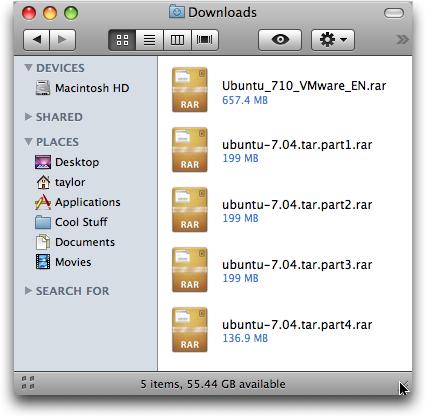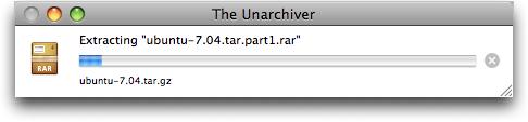 Although the Parallels download comes in four parts, with cheery names like ubuntu-7.04.tar.part1.rar, RAR-friendly apps like Unarchiver automatically concatenate the files. The end result is ubuntu-7.04.tar.gz, which can again be double-clicked on and unpacked to ubuntu-7.04.tar, which again unpacks (why am I reminded of Russian nesting doll puzzles), finally, into the files we seek. The end result is a folder called ubuntu that contains all the necessary files. You can see the files unpacking properly in Figure 3.