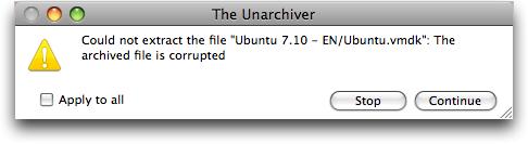 To unpack the RAR archives, I installed and used an application called The Unarchiver, which you can grab from www.versiontracker.com, among other places. I encountered a glitch while unpacking VMware, as shown in Figure 2. I optimistically clicked on Continue, but it didn't work. None of the files extracted were larger than a few dozen KB. Plan B was to download a different Ubuntu virtual appliance, Ubuntu Gutsy Gibbon 7.10 Desktop. And this time, it didn't use BitTorrent, so I watched it slowly download a 468MB image, just to find an archive file ending with .7z, which I'd never seen before. The Unarchiver claimed to deal with 7z archives, but rejected this as corrupted too. Before I gave up though, I downloaded yet another app, 7zX, and after almost 20 minutes, it unpacked successfully.