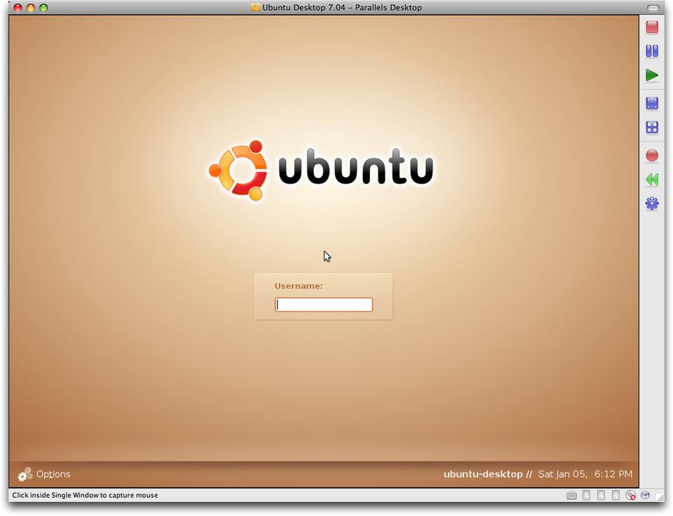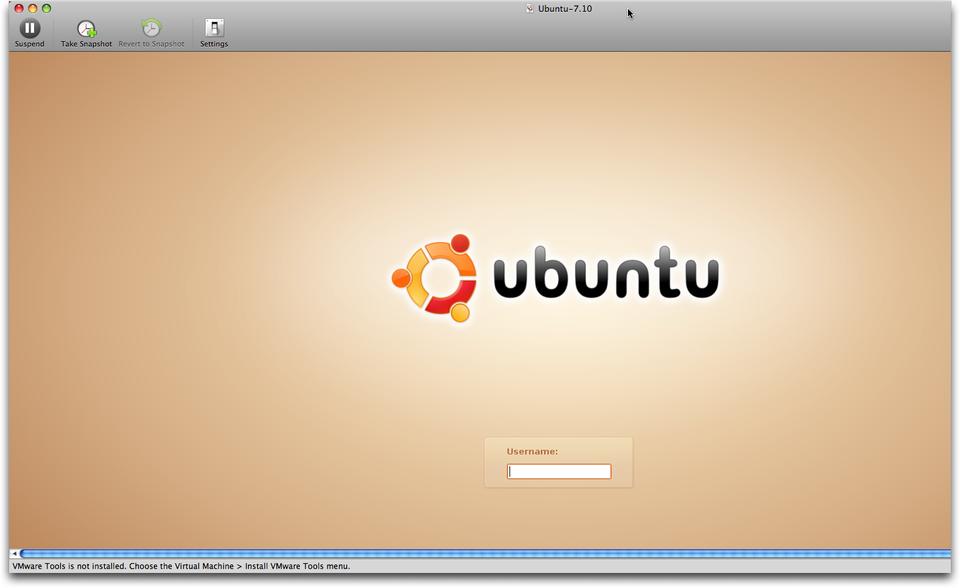 With the VMware Fusion archive, it wasn't as obvious what needed to be double-clicked to get started, but Ubuntu-7.10.vmx seemed like a good choice. It worked, as shown in Figure 6, but notice that the window was far bigger than the Fusion parent window. Additionally, VMware Fusion complained that the VMtools hadn't been installed, which was a surprise given that it's a download I found at the VMware site. Also, the account and password pair didn't work, because it was a different VA image from what I originally had planned. I guessed and lucked out: ubuntu and ubuntu worked, and after fussing with screen resolution settings—but not having to tweak the network settings—I had Ubuntu working within VMware Fusion too, as shown in Figure 7.
