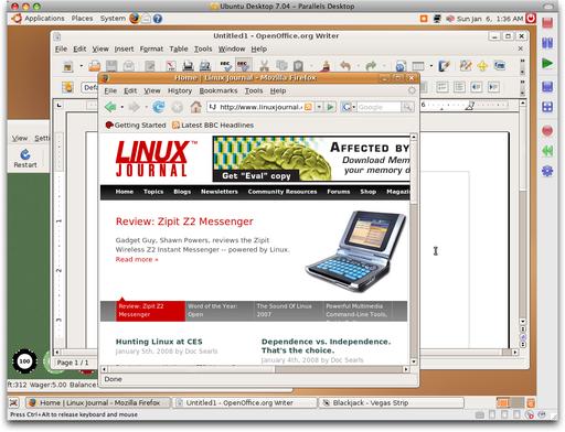 Figure 5. Parallels Desktop running Ubuntu within the Mac OS X world, logged in, on the network and quite usable.