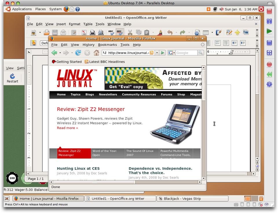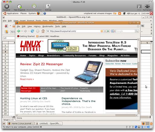 In the end, I did have a fully functional Ubuntu Linux running within each of the two virtualization environments—one was sufficiently fast that when I put it into full-screen mode on my 2.3GHz MacBook Pro running Mac OS X Leopard 10.5.1, I really could use it for editing documents, surfing the Net and experimenting with Ubuntu and Linux graphical apps. In fact, I was rather surprised by how snappy the operating system was within these environments, as I'd run Microsoft Windows XP and Windows Vista within the virtualization world and had found it functional, but not comparable to a real PC. Linux within the virtualization world, however, was quite pleasantly snappy and very usable.