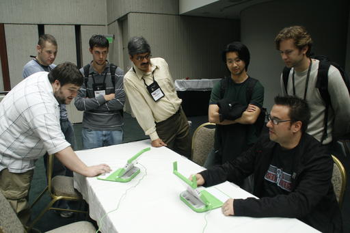 But, I've yet to see an XO in the hands of a child. Nearly all the OLPCs I've seen have belonged to geeks, or have been in use by them. As an example of the latter, see the shot taken at the latest Apachecon.
