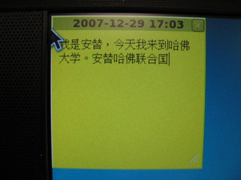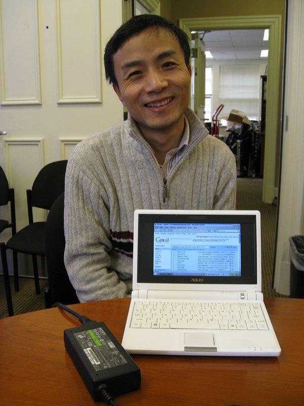 It was at a Harvard meeting where I noticed that Michael was using an ASUS Eee PC, with exceptional ease and enthusiasm. Turns out, it's one he bought from Amazon. It came new with Knoppix, but then he “cracked” it to do more than ASUS expects of ordinary users (for example, expanding windows to a full screen). I was impressed by how rapidly he typed on the keyboard. Later I found that he was actually typing in Chinese. I hadn't realized, until he explained it, that it's actually possible to type Chinese at the speed of speech on a qwerty keyboard. “I type in Chinese about five times faster than I write”, he says. The word Harvard, for example, is four keystrokes rather than seven. So, if you know Chinese, you can use it as a kind of shorthand—impressive. (As you see from the photo, he was using Smart Pinyin.)