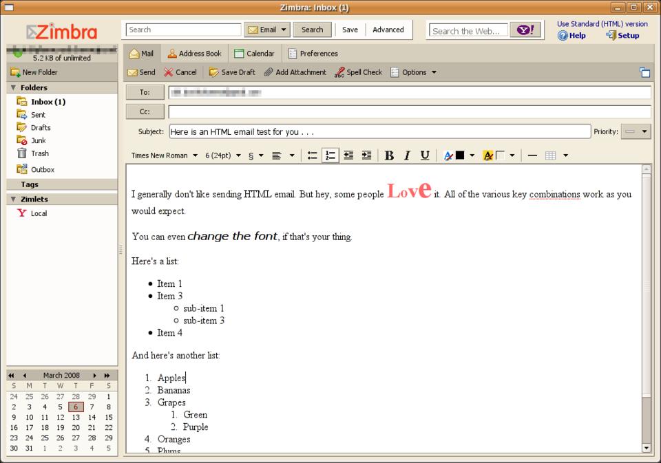 The e-mail composer has all the features I expect from a modern client. You can compose in HTML or plain-text format, and in HTML mode, you have all of the usual control over fonts, lists, colors, text size and so on.