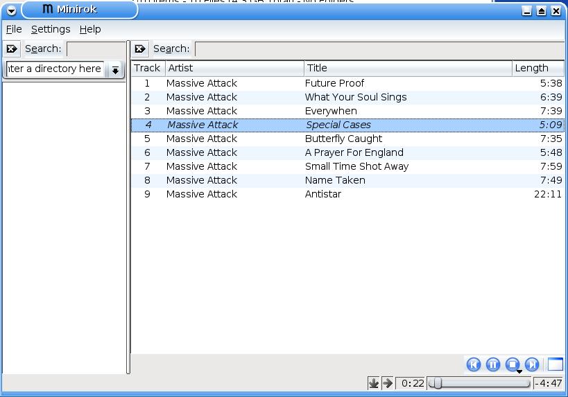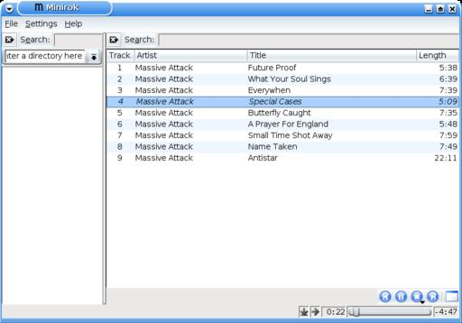 Minirok is a small music player for the K Desktop Environment. As its name hints, it's modeled after Amarok, but with a reduced set of features. In particular, it is designed to cover all the needs and wishes of the author, leaving everything else out. The look and feel is almost identical to Amarok's, though. The main interface is a tree view of the filesystem, with a playlist that can be populated only via drag and drop. There is no collection built from tags, so it's targeted at people whose collections are already structured in a tree at the filesystem level. Searches can be performed both in the tree view and the playlist.
