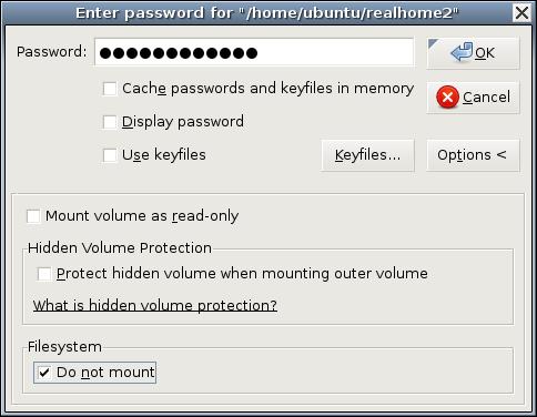 Back in the TrueCrypt GUI (Figure 1), type the full path of our new volume (/home/ubuntu/realhome2) in the text box next to the key icon (or navigate to it using the Select File... dialog), and click Mount. In the box that pops up, enter your volume's password, and then click Options >. Here's where things get a little strange. Click the box next to Do not mount (Figure 2). Now you can click OK.