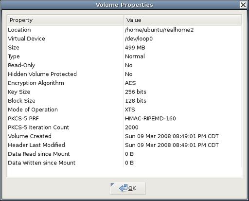 Back in the TrueCrypt main screen, your volume file now should be listed in Slot 1. To find the virtual device to which it's been mapped, click Volume Properties. As shown in Figure 3, realhome3 has been mapped to /dev/loop0.