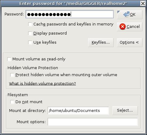 And now, the moment of truth. To use your encrypted TrueCrypt volume with an Ubuntu live CD, such as the one we modified last month, simply boot a system off that CD; insert the USB drive; execute the truecrypt binary from the USB drive or from the CD, if you installed TrueCrypt on your custom image; and mount your encrypted volume, specifying a mountpoint of /home/ubuntu/Documents (Figure 4).