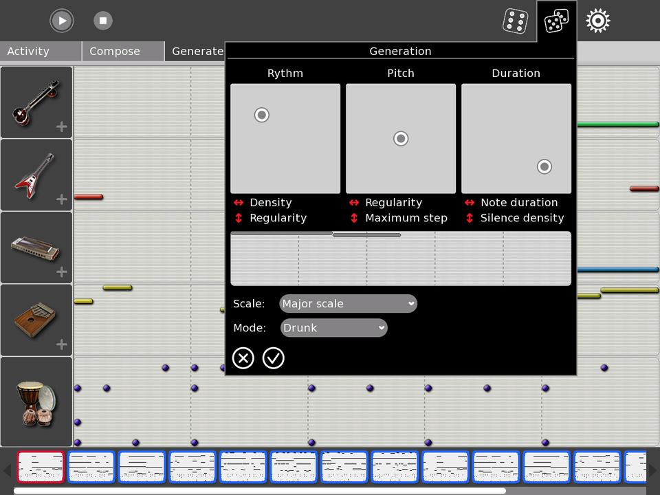 TamTam's Edit (Figure 4) is a music composition/generation program that can be employed as a more-or-less conventional five-track MIDI sequencer or as a user-definable musical automaton. Beyond its transport controls, Edit's toolset differs between its two modes. Compose mode includes Select, Draw and Paint tools; volume and tempo sliders; and controls for recording from the computer keyboard and saving your work as an Ogg file. Generate mode includes only three tools, a Generate Tune toggle and dialogs for the music generation parameters and for other general properties of the sequence. The generation dialog has a cool interactive graphic interface for setting the conditions for each generated event's rhythm, pitch and duration. Pitch material can be defined further with selections from seven scales and four randomization modes, any of which can be defined in real time.
