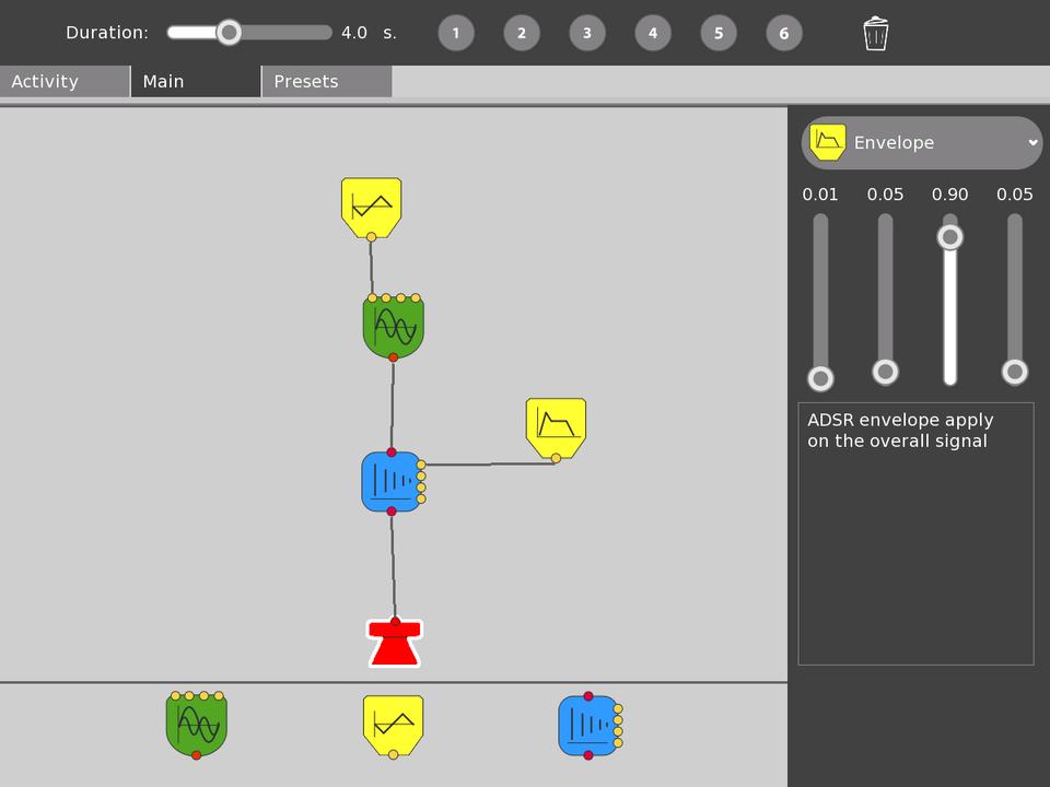 The TamTam SynthLab (Figure 5) is a sound design laboratory for advanced students. According to the TamTam Wiki, the SynthLab is modeled on the famous Max/MSP, a graphic environment for music composition and multimedia development, but it reminds this reviewer of PatchWork, an ancient editor for Csound instruments. In SynthLab, as in the older program, icons representing synthesis primitives are wired together to create a patch—that is, a new sound. SynthLab provides modules for sound generation (FM, sample playback, granular synthesis), modulators (LFO, envelopes) and effects processors (delay, reverb, chorus) that can be wired together in arbitrary connections to create new sounds, all in real time, of course. These sounds can be played on the computer keyboard and/or saved to any of eight slots reserved for use in TamTam Mini.