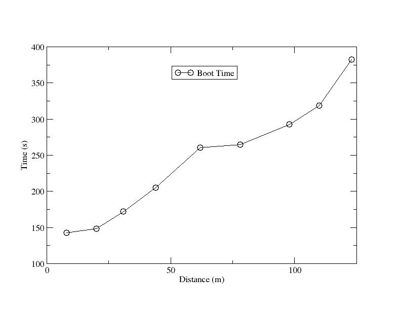 We tested the thin-client network extensively in three different scenarios: first, when multiple clients are booting simultaneously over the network; second, booting a single thin client over the network at varying distances, which are simulated by altering the attenuation introduced by the chamber; and third, booting a single client when there is heavy background network traffic between the server and the other clients on the network.