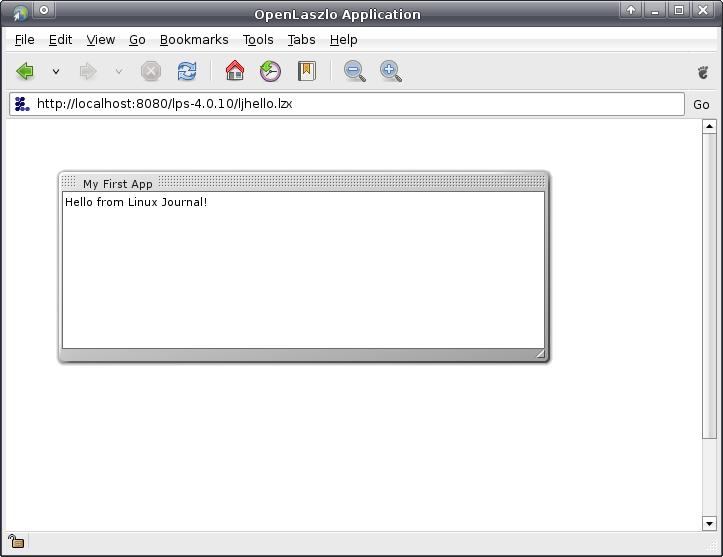 Typing http://localhost:8080/lps-4.0.10/ljhello.lzx into a browser results in the creation of a movable, realizable window, as shown in Figure 1.