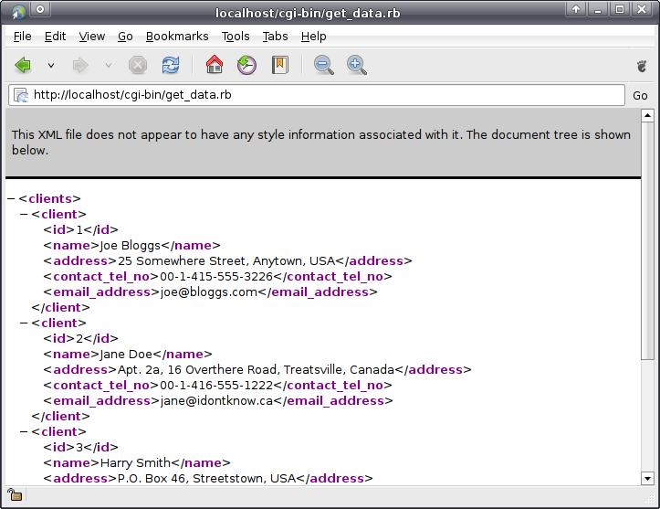 This code is straightforward. The key line is the call to DBI::Utils::XMLFormatter, which takes the result of the SQL query and produces correctly formatted XML. To see the results, install get_data.rb into Apache's cgi-bin directory (setting get_data.rb to be executable), and then type the following into a browser: http://localhost/cgi-bin/get_data.rb. Figure 2 shows the XML produced by the get_data.rb CGI script.