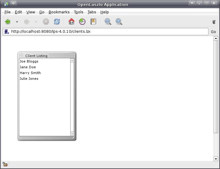 This produces an OpenLaszlo window with the names of the four clients displayed within it, as shown in Figure 3.