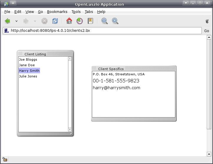 This window has its own name and title values, as well as x, y, width and height values that position it initially to the right of the client listing window. It also has a datapath tag, together with three text elements that reference (using an appropriate XPath specification) the other data elements within our database table. We've specified that the address uses the entire width of the client_info window and can word wrap, while the other two pieces of data are displayed in differently set font sizes. When this LZX application (called clients2.lzx) is loaded into the browser, the client list appears in the original window, and as each client name is clicked, the second window refreshes to display the address, telephone number and e-mail address of the currently selected client. If you are following along, note how the user receives visual feedback as each client name is clicked. Figure 4 shows an example, with one client name highlighted (clicked) and the associated details appearing in the second window.