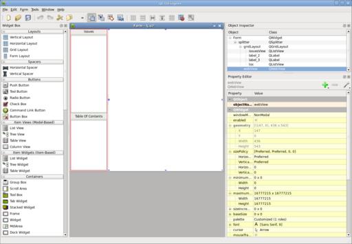 The interface was built in just a few minutes using Qt Designer. On the left-hand side are two QListViews. The one on the top will contain the list of available issues, and the bottom one will contain the table of contents of the currently selected issue. On the right-hand side is a QWebView.