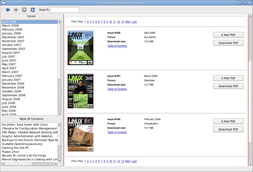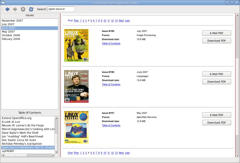 Qt always has provided fantastic cross-platform support with integration into the desktop. With the introduction of QtWebKit, developers now can make a cross-platform desktop application for a Web site. Linux Journal provides a digital subscription that lets you download older issues. The Web site is very simple and a perfect candidate for building a small application around. Although the Web site does have the table of contents, it does not provide a way to search all the available issues for articles. So the application I am going to make provides an easy way to search through the issues and let you download them.