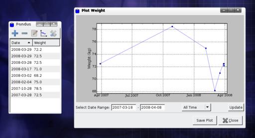 Tracking your progress is really what Pondus is about though, so you will want to jump over to the graph section—the fourth button, or Plot data. Click the button, and a window titled Plot Weight appears with a neat line graph representing your weight over a period of time. If you look at the bottom right, there's a drop-down box with All Time written in it. This allows you to filter out the rest of the information to what you've had over the past year, or just the past month. If you want to filter your time to something more specific, on the bottom left are two fields called Select Date Range. Enter the start date you want to see in the first field and the end date in the second field, click Update on the far right, and the graph will update with the selected information. For those of you who want to save a copy of what your progress has been, clicking the Save Plot button at the bottom lets you save your graph as a .png file. I'm a weedy little runt myself, so I'm not trying to lose weight, but rather gain it, so check my screenshot for an example (which is in kilograms by the way, I don't way 72 pounds).