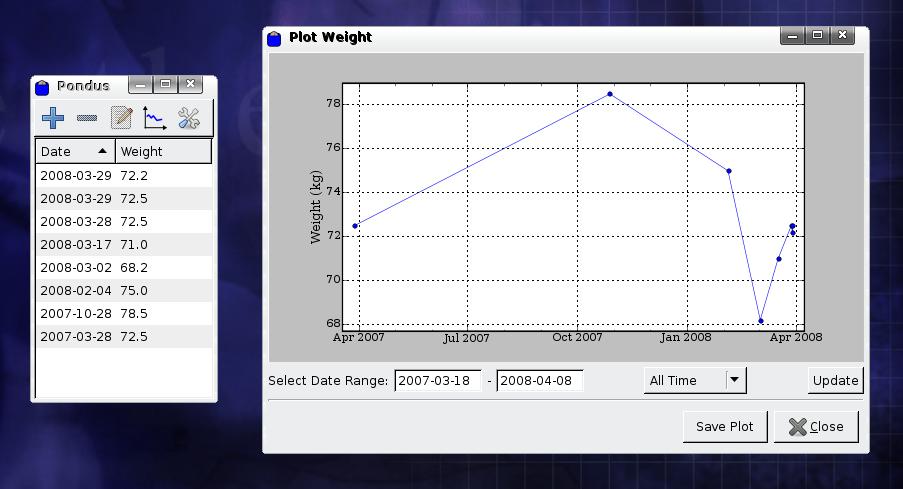 First up this month is a weight manager, Pondus. According to its Web site: “Pondus is a personal weight management program written in Python and Gtk+2 released under the GPL. It aims to be simple to use, lightweight and fast. The data can be plotted to get a quick overview of the history of your weight and is stored in XML files for easy access and modification with other programs.” Simple it is, indeed, and the installation isn't too shabby either. Pondus lets you track your weight over a period of time and displays your progress with a graph. It also switches between metric and imperial measurements.