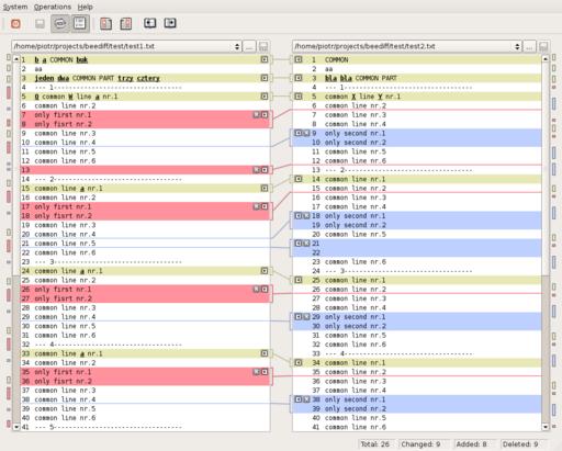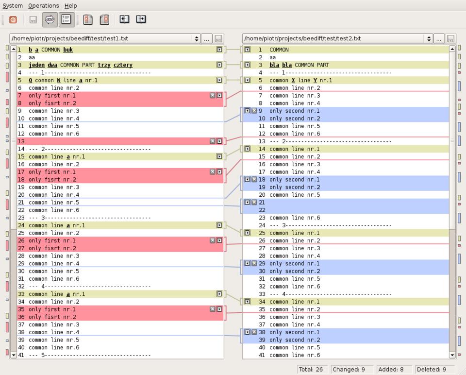 BeeDiff (beediff) is a GUI program for comparing text differences between two files, and any differences will be highlighted in different colors depending on the type of difference. Any differences found then can be deleted or copied between files. BeeDiff is developed with new Qt4 libraries, and as such, it's very quick and lightweight. It also happens to be quite easy to install, which is another bonus.
