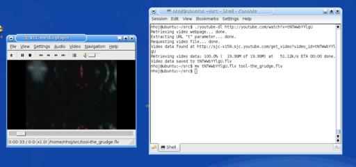 youtube-dl now saves it to your hard drive, and it even has a spiffy text-based progress monitor. Once downloaded, the filename just looks like random garbage. Rename the file to nameofyourvideo.flv (the .flv extension is the most important part), and open it with a strong video player such as VideoLAN or MPlayer.