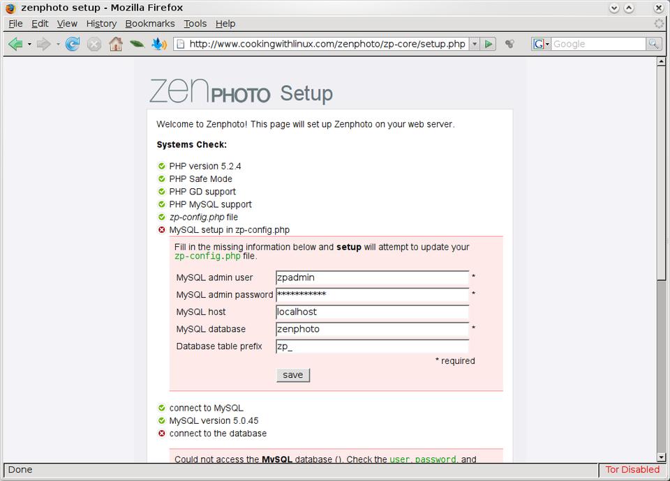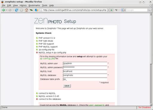 The setup screen checks to make sure you have the right software installed, including PHP support and modules. In my example, I haven't yet created my database. Use whatever tools you are comfortable with (for example, Webmin, PHPMyAdmin or the command line) to create a database and a user that has permissions to update that database: