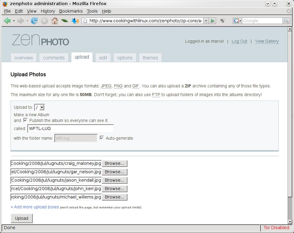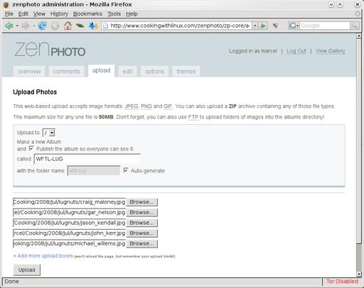 When you log in to the admin interface, you are presented with several tabs that let you define security, edit existing galleries and comments, adjust the layout and theme, and a whole lot more. What you most likely will want to do at this point is create an album and upload some photos. To create your first album, click the Upload tab. If you haven't done so already, create a new album by providing a name. Then, one by one, you can browse for your photos and add them to the list (Figure 6). The default allows for five individual photos, and you can upload them five at a time, but if you prefer, you can click the Add more upload boxes link at the bottom. When you are done, click the Upload button.