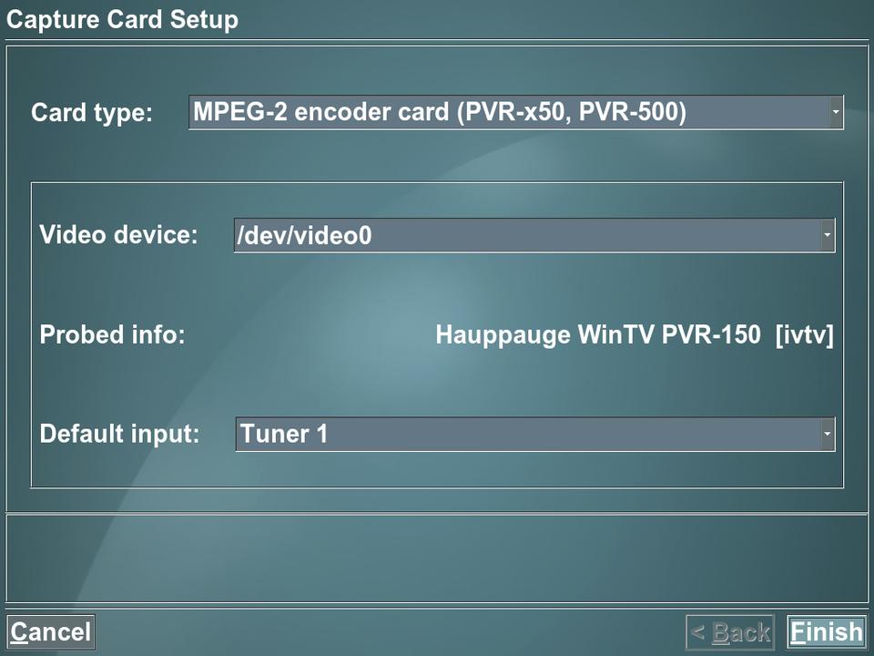 • Tuner card: you need a tuner card to take the digital or analog television signal and turn it into something your computer understands. The best ones for use with Linux are the Hauppauge WinTV-PVR series; the PVR-150 is a single tuner with a built-in MPEG encoder, the PVR-350 is a single tuner with built-in MPEG encoder and decoder, and the PVR-500 has two tuners with an MPEG encoder only. I bought my first PVR-150 for $85 (in Canada), including a remote and IR blaster (I'll explain what that is later). Regular prices in the US range to as low as $60. I bought my second one on sale for $25. I recommend starting with one PVR-150, and then buying another later if you feel the need. Price: $25–$85.