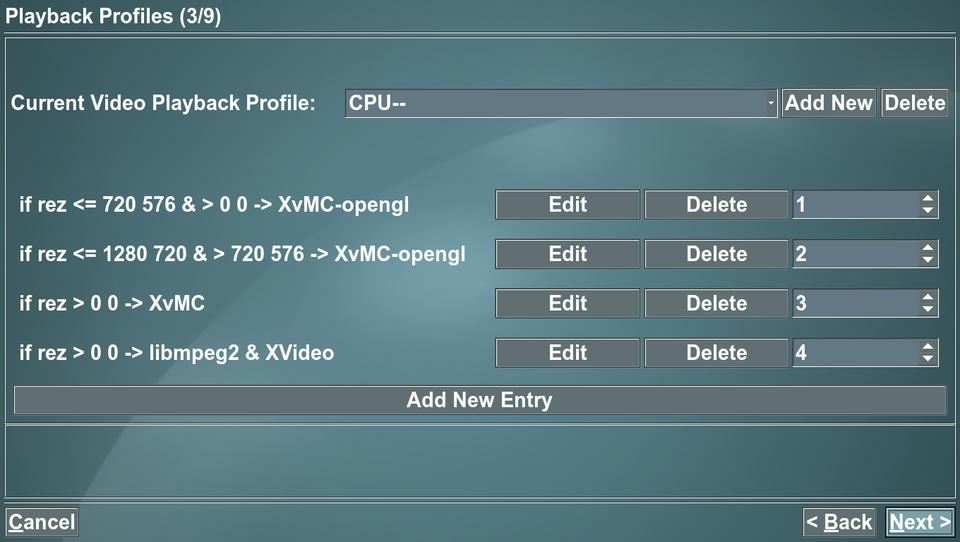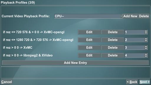 Another benefit of NVIDIA's superior Linux support is that part of the MPEG decoding work can be delegated to the video card using XvMC (X-Video Motion Compensation), reducing the load on the CPU. To enable XvMC, go to Utilities/Setup→Setup→TV Settings→Playback. On the third screen, change the Playback Profile to CPU--. XvMC didn't kick in on mine until I deleted the top line of the profile (referring to ivtv). You can tell if it's operating because the on-screen display changes to grayscale. You also can tell because the CPU usage will go way down. The Xorg process dropped to less than 10% during playback; the sum of Xorg and mythfrontend is always less than 30%. As a result, additional processes (including creating and burning DVDs) no longer affected playback.