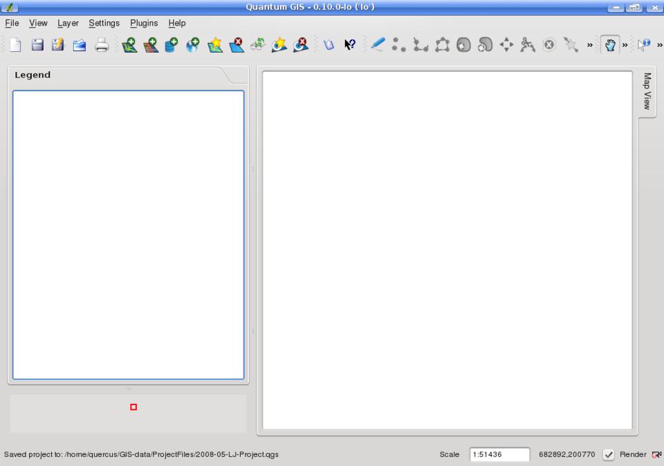 However, if I want to change the level of detail in the Map View, I must switch to the Zoom tool. Although the Zoom tool is intuitive in function, beware, for it is disappointingly unintuitive in practice for three reasons. First, the Zoom tool resides in the View menu and is not available as a toolbar option. Second, the Zoom In and Zoom Out functions work only using the wheel of a mouse. Because I work on a laptop, I had to acquire a USB mouse just to have zooming capabilities. Third, unlike with most GIS and graphics applications, QGIS does not simply allow one to draw a box around the desired zoom-to area.
