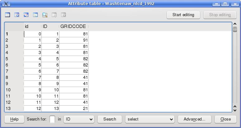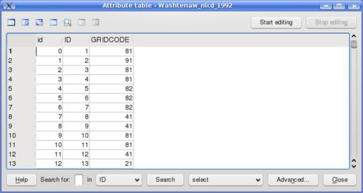 How do I know which database field I should classify, as well as the meaning of each classification? To find out, I sometimes need to leave the Layer Properties menu and examine the attribute table, a display of the database containing the attribute data for the layer. For example, I can examine the attribute table of the land-use layer by right-clicking on the title in the Legend (on the main GUI) and selecting the command Open attribute table. An example of an attribute table is shown in Figure 2. The land-use attribute layer contains a field ID to designate each polygon, as well as the field GRIDCODE to classify each one. Oftentimes the attribute table also contains a field with the label for each classification. Although such a field is missing from the land-use attribute table, a separate file with classifications is found in a text file included in the downloaded dataset.