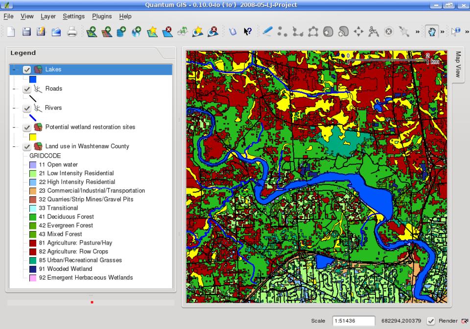 After unpacking the datasets, I load these five shapefiles in this order: allroads_161v7b.shp (roads), hydro_161v7b.shp (rivers), hydropoly_161v7b.shp (lakes), Washtenaw_Potential_Restoration_Area.shp (the name says it all) and Washtenaw_nlcd_1992.shp (land use).