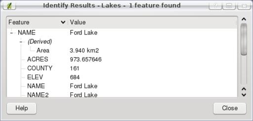 Meanwhile, the Identify Features tool is more straightforward and less cumbersome. To activate the tool, I simply press the toolbar icon designated by a mouse arrow next to the letter i in a blue circle. Then, I can navigate to any feature in the Map View window and essentially call up that feature's characteristics—that is, its entry in the attribute table. In order to select the appropriate feature, however, I must select the correct layer in the Legend. For example, if I am searching for information about a lake, I can't be on the Roads layer—the Lakes layer must be selected. Figure 4 shows how I clicked on a large lake and learned its size, elevation and name, Ford Lake.