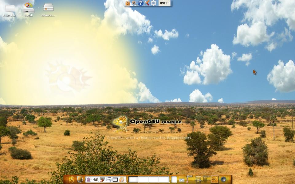 OpenGEU includes two themes: sunshine and moonlight. Both are exquisitely beautiful with animated elements—typical E style. In the sunshine theme, the sunbeams appear to shine forth at certain times, and under the moonlight theme, the Enlightenment E logo apparent on the moon reflects within the ripples of an ocean of water at regular intervals. Users can change between themes at the press of a button. Other themes are included, and users can download additional themes from get-E.org.