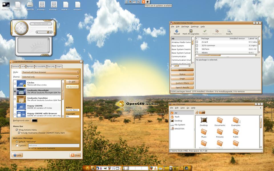I first should mention that OpenGEU is not an official Ubuntu derivative. It is based on Ubuntu and shares its repositories, but it's not Ubuntu. OpenGEU's subtitle explains the philosophy behind this newer distribution: “when a GNOME reaches Enlightenment”. OpenGEU's ambition is to fill in the missing parts of E17 with the working parts of the GNOME desktop or Xfce. And, it does this very well. This hybrid system is a fully functional Enlightenment desktop with the power of Ubuntu's GNOME desktop melded with the effects of E17. For example, the file manager missing from E17 is filled with the Xfce Thunar file manager, and it works without a hitch.