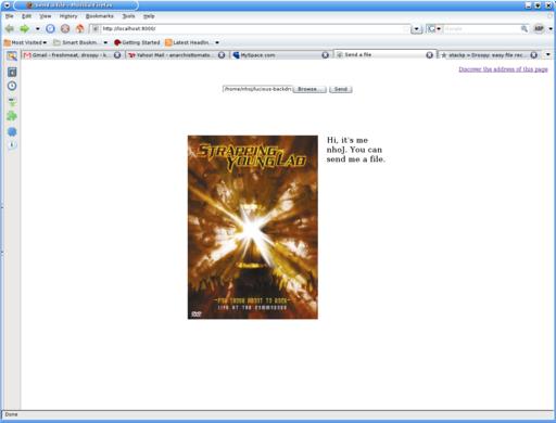 If all is well, you should have something that resembles the screenshot shown here. This is all well and good, but people need to upload to you. Clicking Discover the address of this page will give you a URL that you can then pass on to your friends, so they now can upload to you, provided the script is running. To upload to one of these pages, there's a rather obvious empty text field with Browse and Send buttons sitting next to it that will allow the people uploading to choose the file they want and send it to you. Once they have sent it, a notification should appear on your terminal output, and the new file will be sitting in your uploads directory.