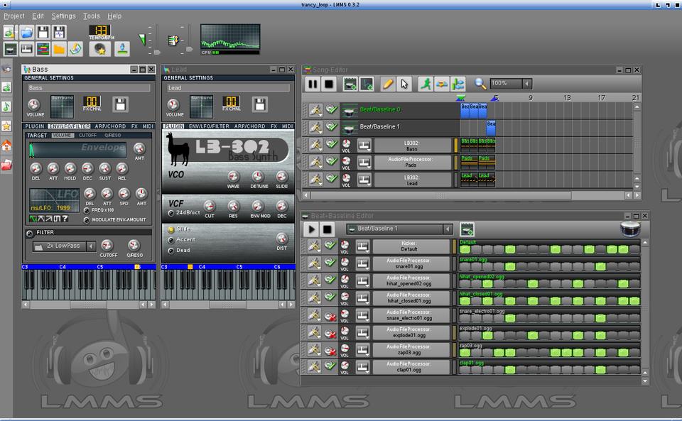 ALSA supplies command-line utilities for simple recording and playback of audio and MIDI. These tools (arecord/aplay and arecordmidi/aplaymidi) are useful for quick uncomplicated purposes, and most distributions provide GUIs to ease their use. At the next level, LMMS (Linux MultiMedia Studio; Figure 1) and Jokosher are good examples of desktop music production software designed in the manner of Apple's popular Garage Band. They engage the user quickly with colorful uncomplicated GUIs, but they are quite powerful within their design constraints. Both programs are in current development and have active communities of users and developers. Wouter Boeke's AMUC (Amsterdam Music Composer) is another less-weighty program that includes many attractions for the desktop composer, including an integrated synthesizer, notation capability and very light resource requirements.