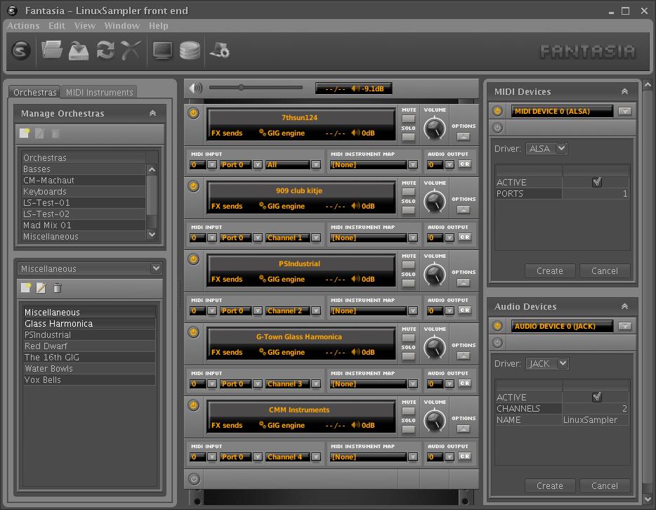 Samplers are represented by Specimen and the LinuxSampler Projects. These applications differ in some significant ways: LinuxSampler utilizes files in the GIG format made popular by Tascam's GigaSampler, and Specimen is happier with soundfile formats supported by libsndfile. LinuxSampler (Figure 2) is a client/server architecture with at least two GUIs and a command-line interface. Specimen is a standalone GTK-based application. LinuxSampler and Specimen both support JACK, but Specimen also supports ALSA and is a LASH-savvy application. LinuxSampler has more features associated with the GigaSampler model and is the more consistently maintained program, but both samplers are useful in the complete Linux music-maker's studio.