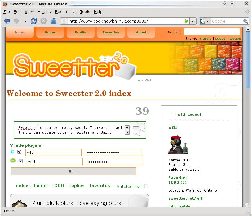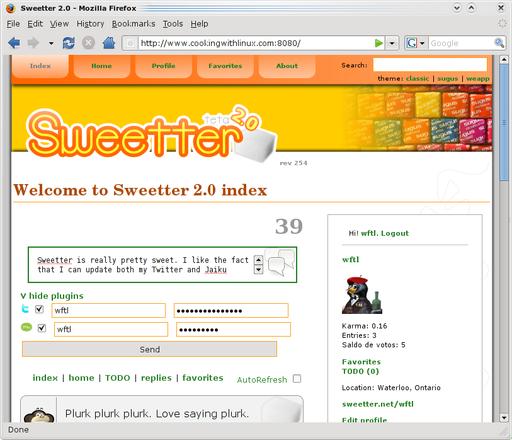 Sweetter also supports plugins that allow you to post updates not only to Sweetter, but to Twitter and Jaiku as well. This feature isn't always on, however. If you want your posts to hit multiple services, click the Show plugins link directly below the update box on the main page. Authentication fields for Twitter and Jaiku will appear. Make sure you click the check box beside each service you use before clicking Send.