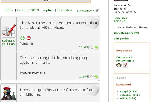 Figure 11. Each Sweetter update is subject to a vote by other readers. The number of posts you make and the votes you receive all go toward your Karma.