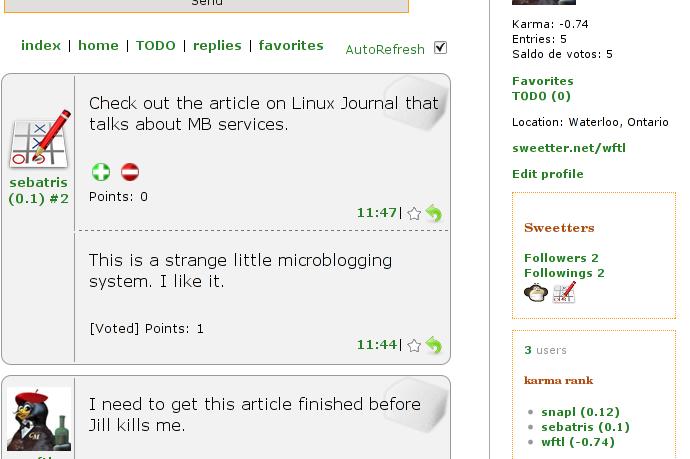 Here's another Sweetter-unique feature. Aside from your usual MB posts, Sweetter also is a kind of on-line to-do list. Be careful how you post though. Sweetter may complain that you are using it like an instant-messaging service, and it doesn't like that.