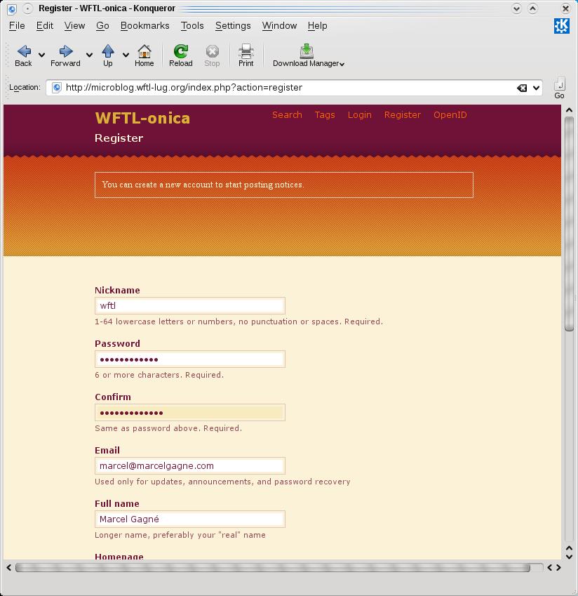 After installing Laconica, point your browser to your new Laconica server and register your first account by clicking the Register link. You'll be transported to a page where you can fill in your nickname, password and other information (Figure 2).