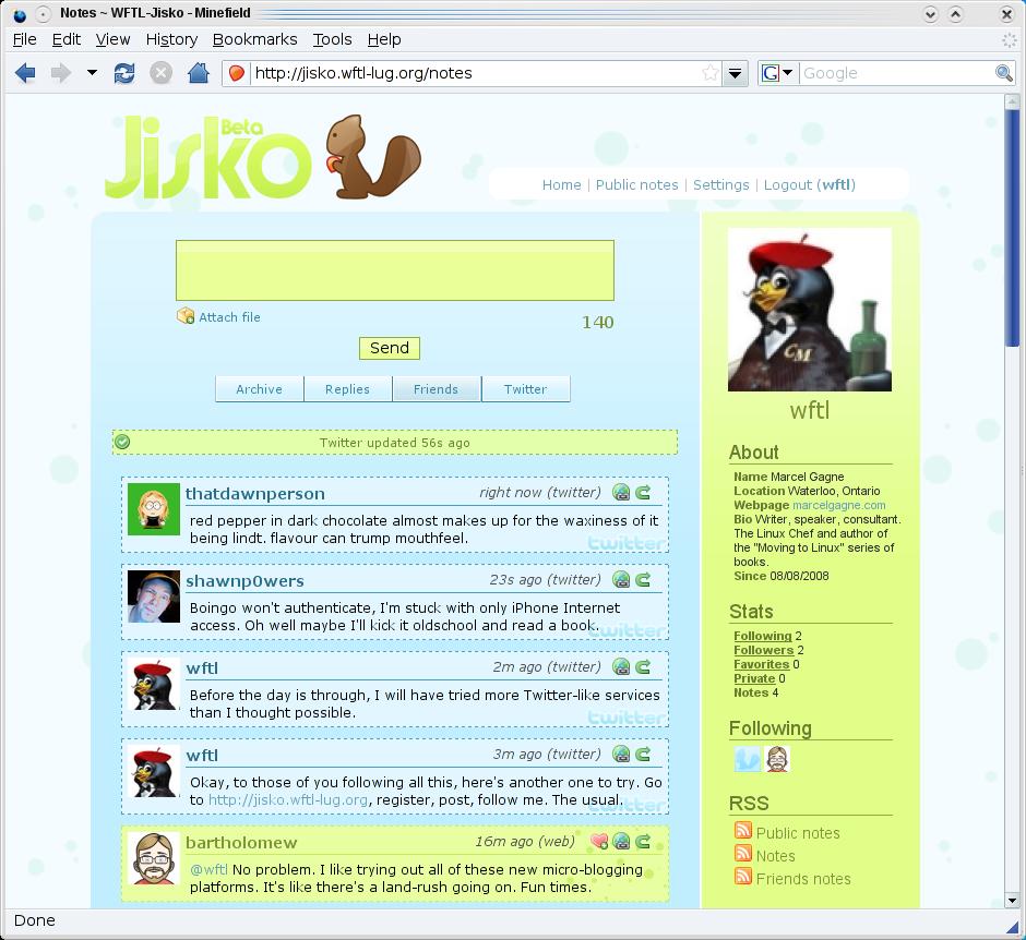 As with Laconica, a confirmation e-mail message will be sent along with a link for you to acknowledge. I found the text of this message to be somewhat amusing, so I thought I'd share it with you: “Someone (probably you) has requested an account on Jisko.” Who else could it be? I guess it's pretty rare that somebody would create an account for you and not tell you the details. After acknowledging the e-mail, you can log in and start posting updates. Find and invite friends to join, and start updating each other on every little thing of interest that happens. It doesn't take long to fill 140 characters.