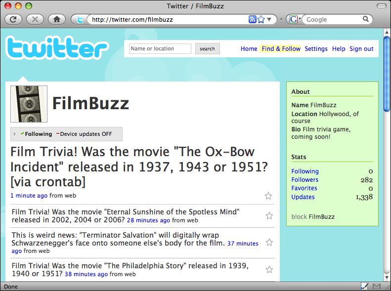 Next month, we'll finally move to a new scripting topic. And, in the meantime, if you want to enjoy the fruit of our extended labor and try your hand at film trivia, follow @FilmBuzz on Twitter at twitter.com/filmbuzz.