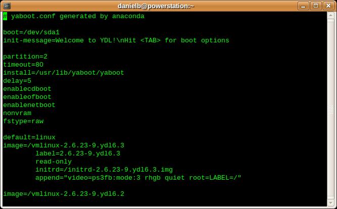 Being unfamiliar with Yaboot, I elected not to tinker with it or even spend much time looking at it. The system booted fine, and I didn't want to render the box unbootable inadvertently. The Yaboot configuration does look marginally similar to GRUB's, and I'll leave it at that.